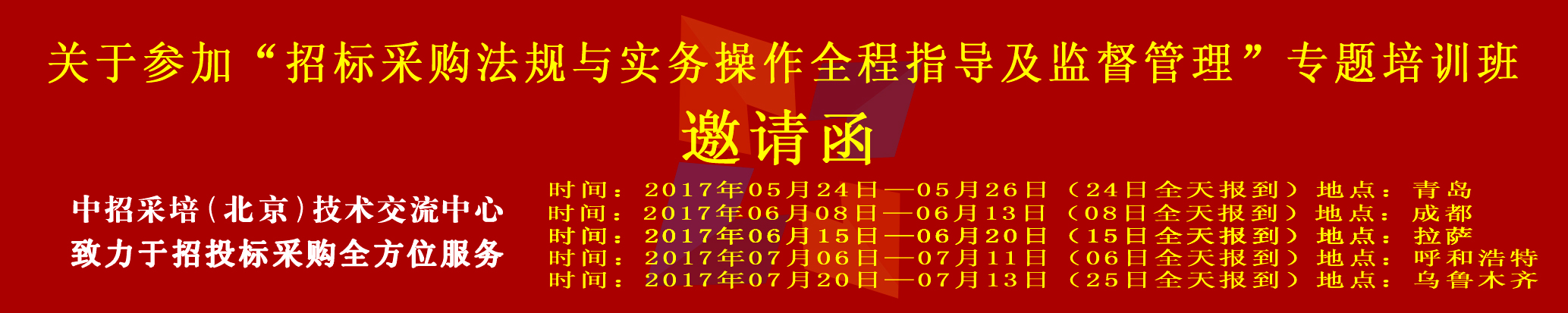 为帮助各级管理部门、招标采购从业人员及时解决传统招标采购项目操作的疑难问题,招标采购技巧、政府购买服务操作实践,做好项目方案策划、全面了解招标文件编制的主体、形式要件、程序要求、商务技术要求及评审因素的编制方法及原则等内容,合理解决招标采购争议事宜,加强招标采购过程监督执法及行政监督人员的管理水平,中招采培招标采购培训中心决定举办“招标采购全流程指导与案例分析及运作实操”专题培训班。本次课程针对我国当前招投标市场存在的热点问题展开讨论,结合从业人员实际工作中的问题进行案例分析。请各单位积极组织本单位及下属单位相关人员参加。