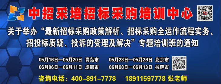 为帮助各级管理部门、招标采购从业人员及时掌握国家最新招标采购政策,解决招标采购相关热点问题、提升从业人员业务全运作流程操作能力(招标准备-发布公告-组织审查投标人资格-编制备案发售招标文件-现场踏勘-投标预备会-编制递交投标文件-依法组建评标委员会-开标-评标-公示中标-签约),中招采培招标采购培训中心决定举办专题培训班。请各单位积极组织本单位及下属单位相关人员参加。