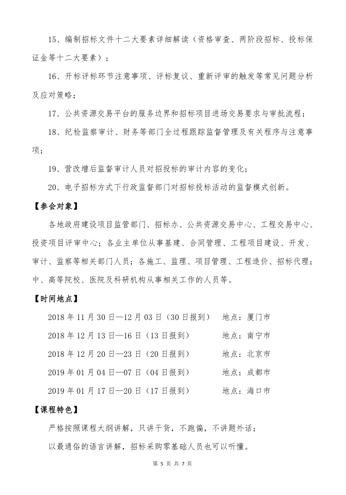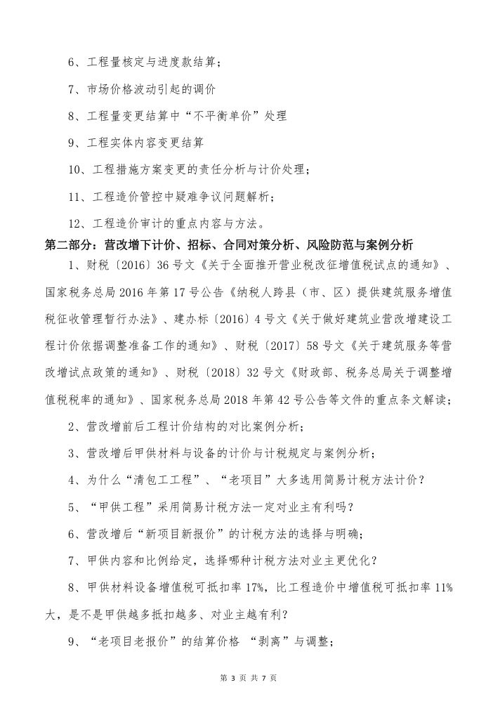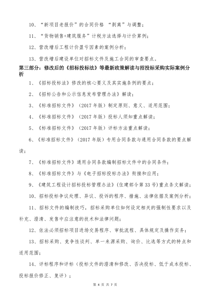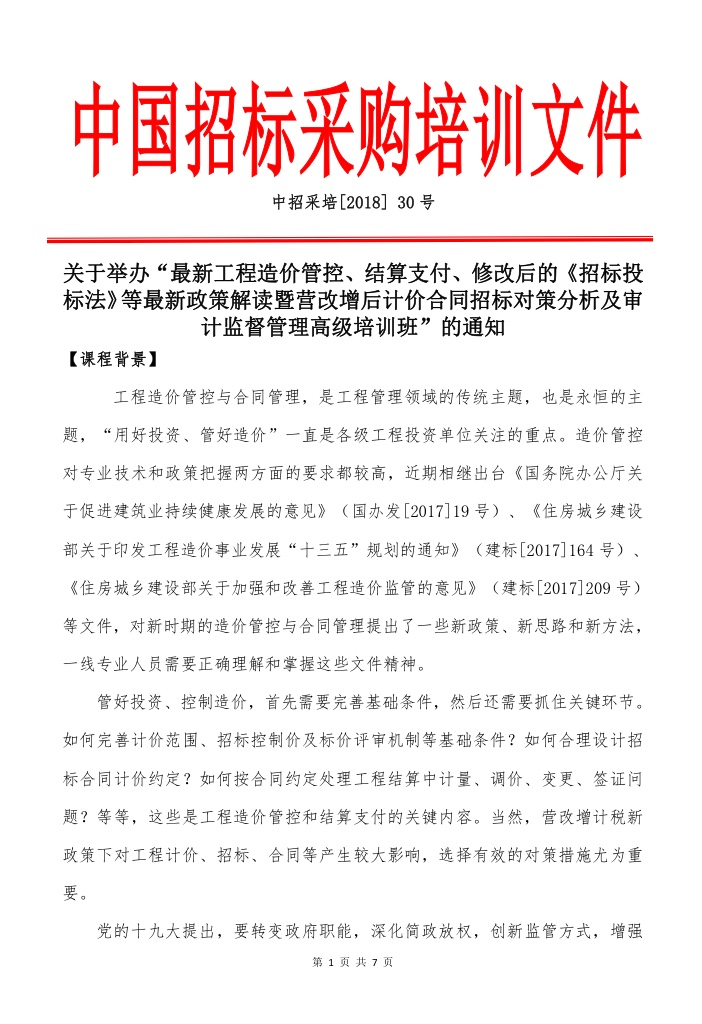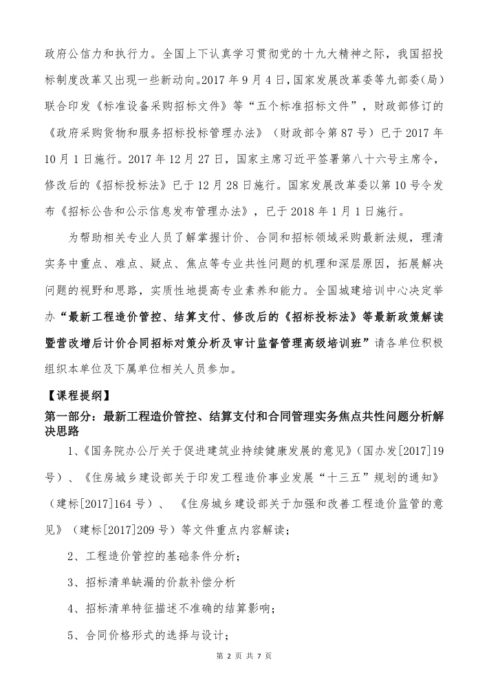 关于举办“最新工程造价管控、结算支付、修改后的《招标投标法》等最新政策解读暨营改增后计价合同招标对策分析及审计监督管理高级培训班”的通知