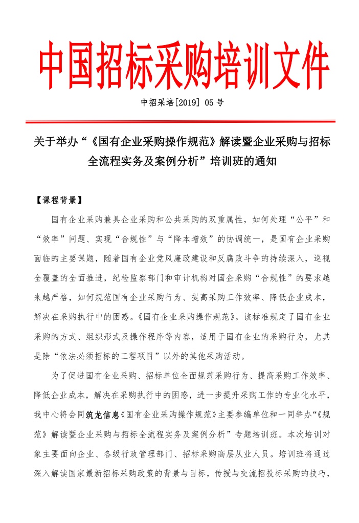 2019《国有企业采购操作规范》解读暨企业采购与招标全流程实务及案例分析培训班