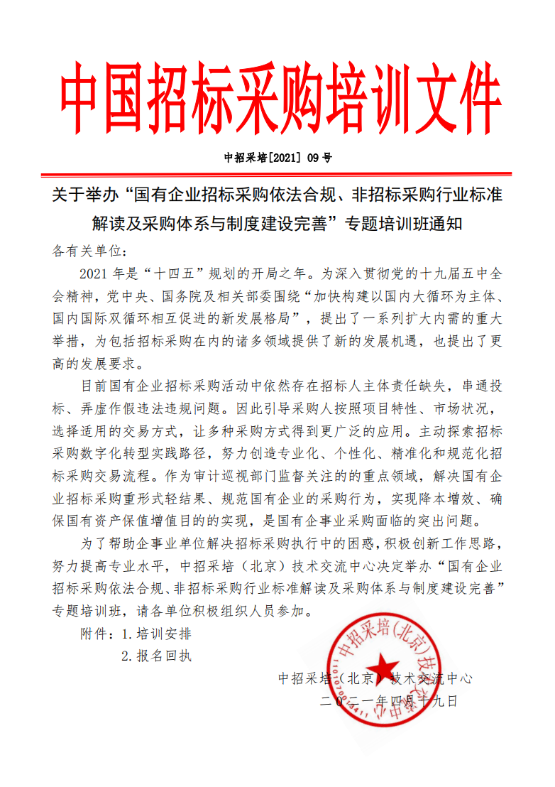 关于举办“国有企业招标采购依法合规、非招标采购行业标准 解读及采购体系与制度建设完善”专题培训班通知