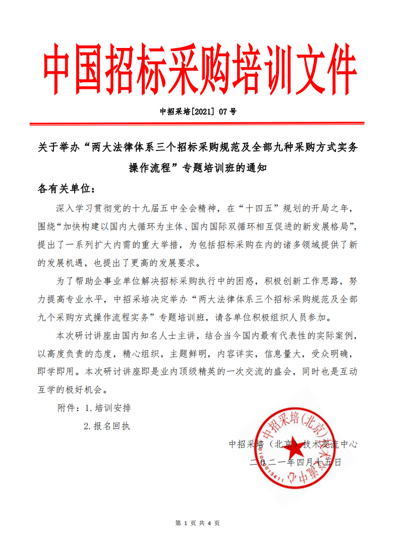 关于举办“两大法律体系三个招标采购规范及全部九种采购方式实务 操作流程”专题培训班的通知