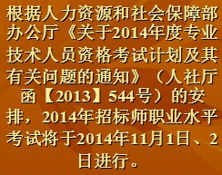 根据人力资源和社会保障部办公厅《关于2014年度专业技术人员资格考试计划及其有关问题的通知》(人社厅函【2013】544号)的安排,2014年招标师职业水平考试将于2014年11月1日、2日进行。