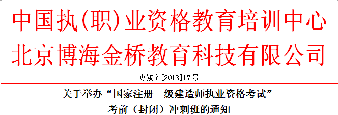 根据国家人社部、国家住房和城乡建设部相关政策调整,以及2014年考试指定辅导教材有非常大的变化;建造师资格考试难度增加。考生工作岗位都在施工第一线,考前工作较忙,考试时间临近,复习时间也相对紧张;为了帮助广大考生顺利通过考试,根据国家相关政策和制度的贯彻情况,经研究:中国执(职)业资格教育培训中心、北京博海金桥教育科技有限公司决定共同在北京举办加强型封闭式考前冲刺班,请尽快组织安排相关人员报名,把握住这最后一次常规考试机会,做好考前的冲刺,迎接考试。本次冲刺班我们将在总结以前多次考前集训及应试的基础上,针对考试的知识结构和命题要点,全面锁定可考点准确把握考试的重点难点、有效直击考试命题精髓,精心设计教学课程及现场测试办法。使学员顺利通过2013的考试。现将有关事宜通知如下: